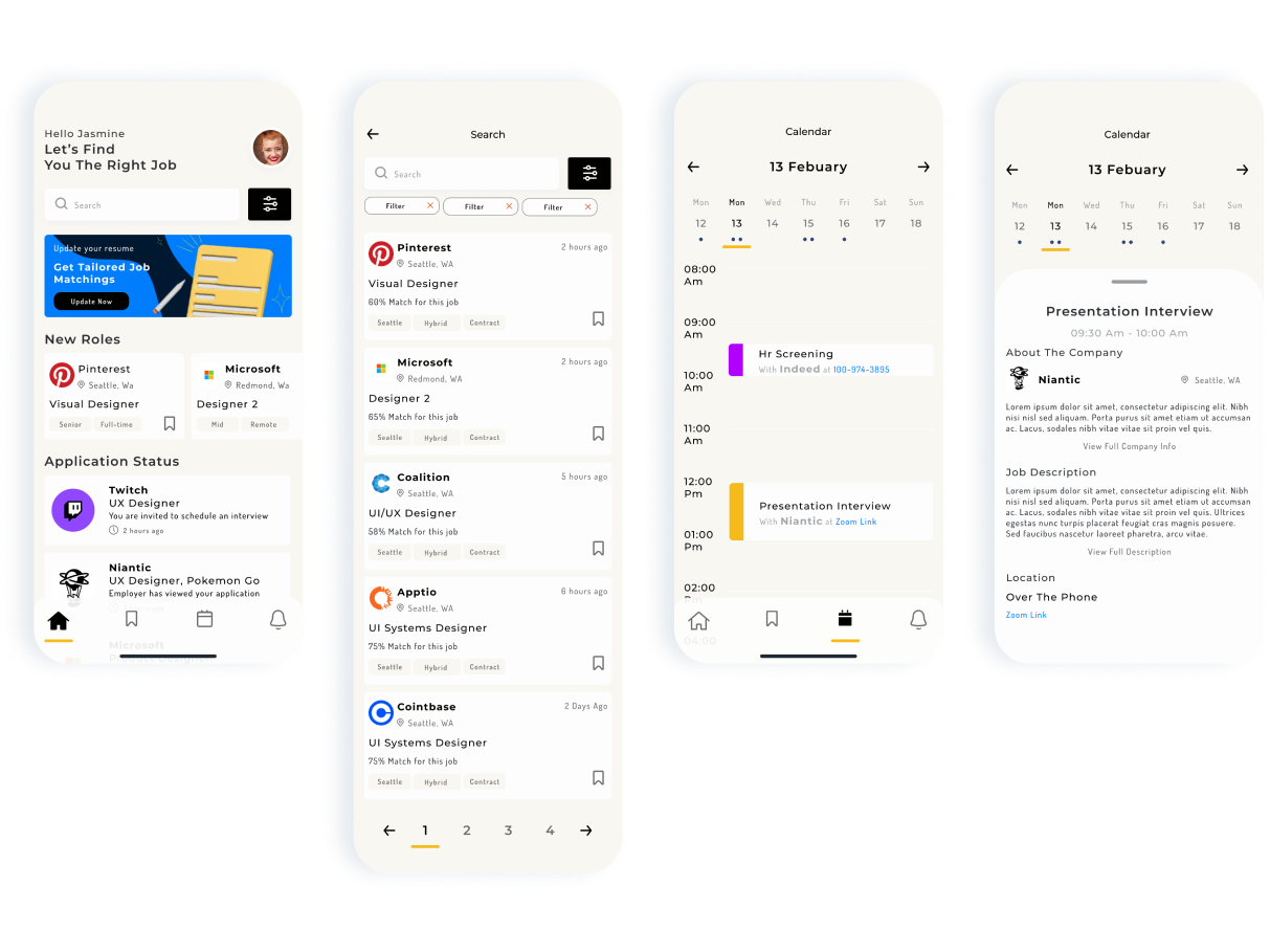 Through user interviews and competitive analysis, three core pain points emerged consistently: irrelevant matches, application chaos, and zero visibility into interview scheduling.